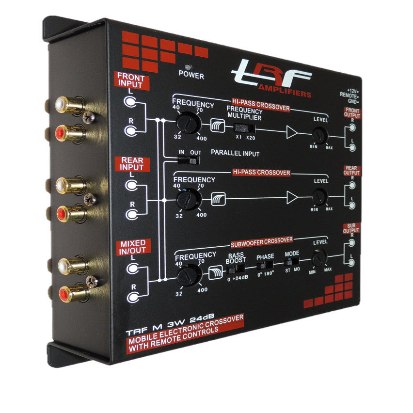 MODEL: TRF M3W24DB 2-Way/3-Way Electronic CrossoverWITH REMOTE CONTROLS BASS BOOSTBass boost (0-24dB @ 45Hz)Maximum pre-amp output:8.5-Volts RMS in 14.4VMaximum pre-amp output:5-Volts RMS in 12.6VFront High Pass frequency: 32Hz - 400Hz (Midrange)Front High Pass frequency: 640Hz - 8 kHz (Mid / High)Rear Low Pass frequency: 32Hz - 400Hz (Subwoofer)Rear High Pass frequency: 32Hz - 400Hz (Midrange)